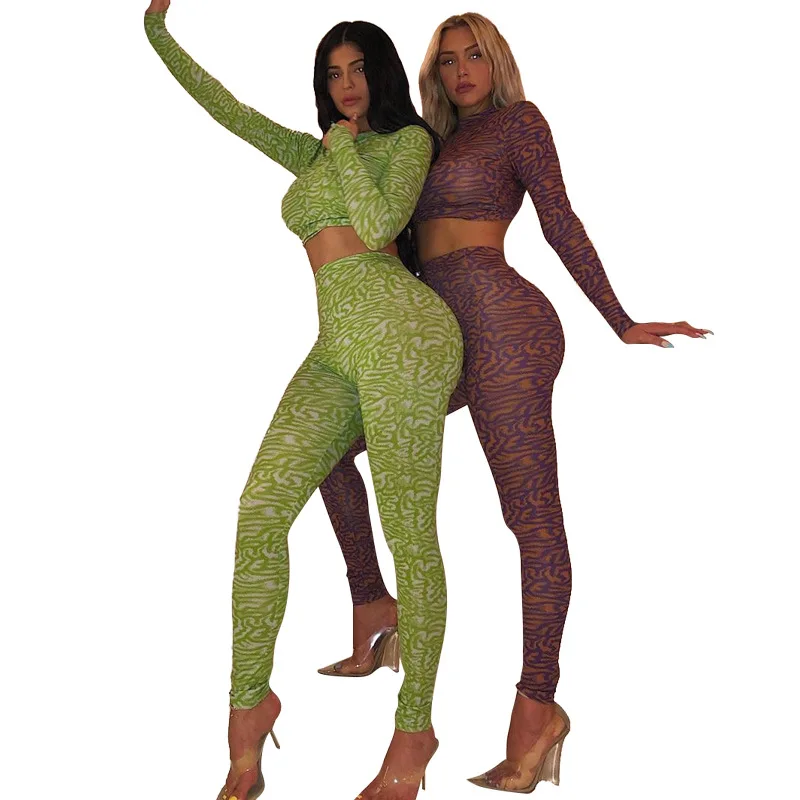 women fitness two pieces set elastic skinny print outfit 2019 autumn woman full sleeve crop top + h